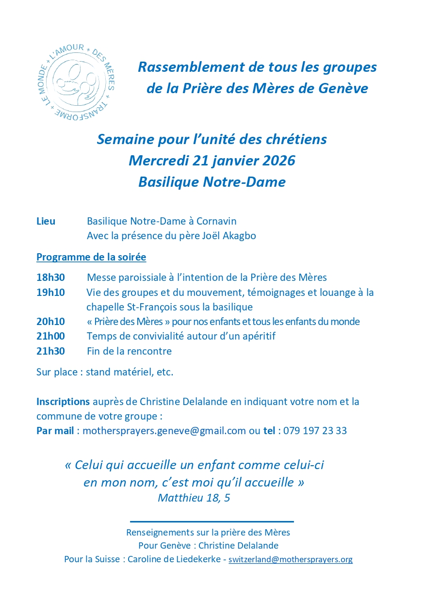 Plusieurs groupes de prière des Mères se réunissent à Genève chaque semaine. Si vous cherchez à rejoindre un groupe, vous pouvez contacter :